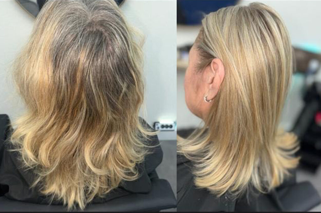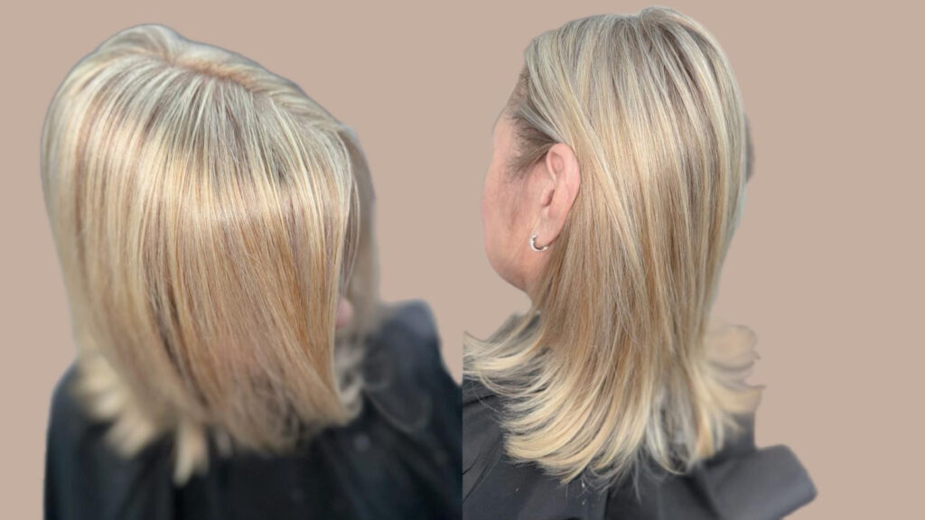 komplette Coloration, einheitliche Blondierung, klar & natürlich definiert unterstrichen vom passenden Schnitt für tolles glattes schulterlanges Haar.